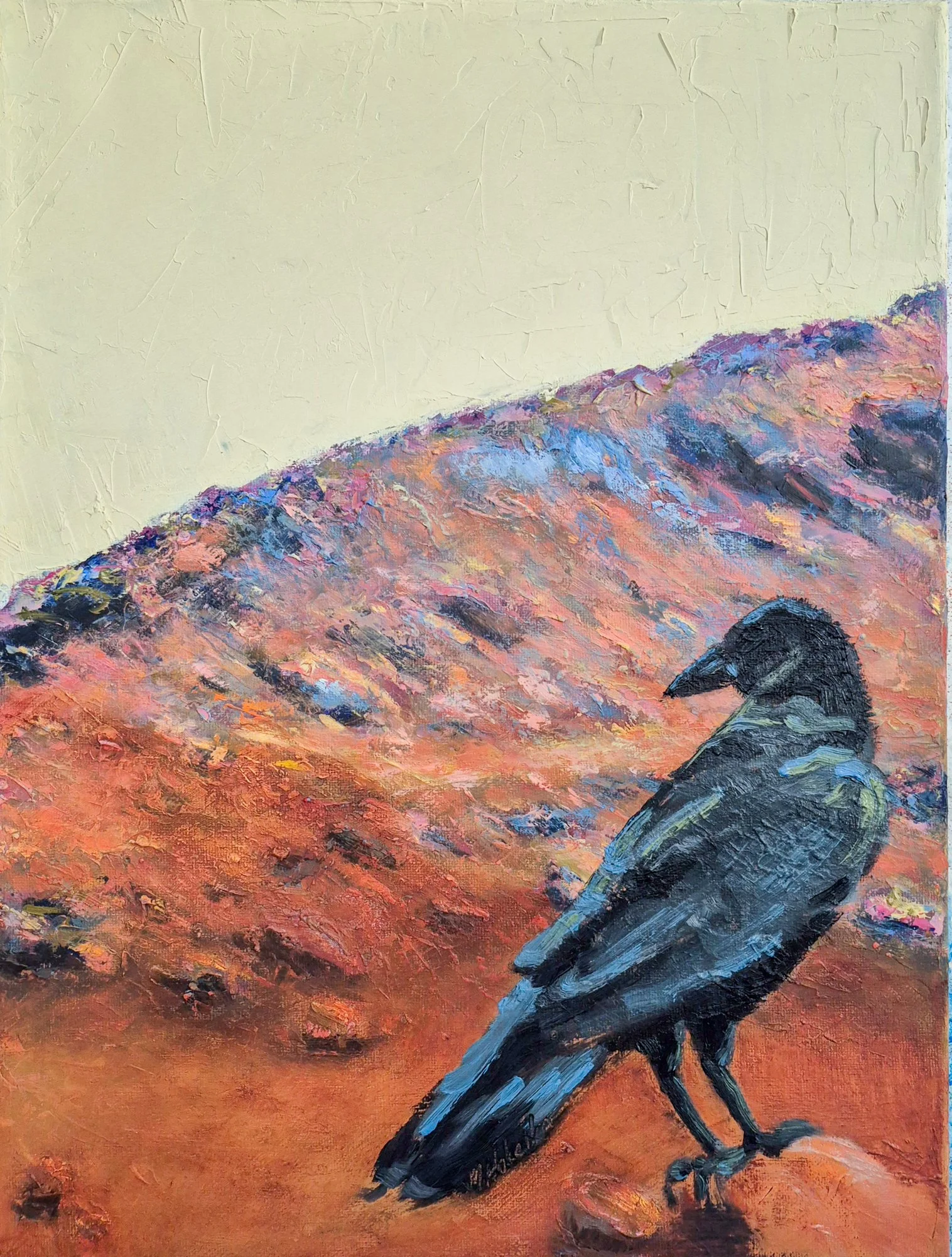 The birds are based on a funny raven I saw while vacationing out west in October 2024. Painting the ravens onto a Martian landscape, to me, feels symbolic of my own adventures to faraway lands: intellectual, imaginative, and physical.