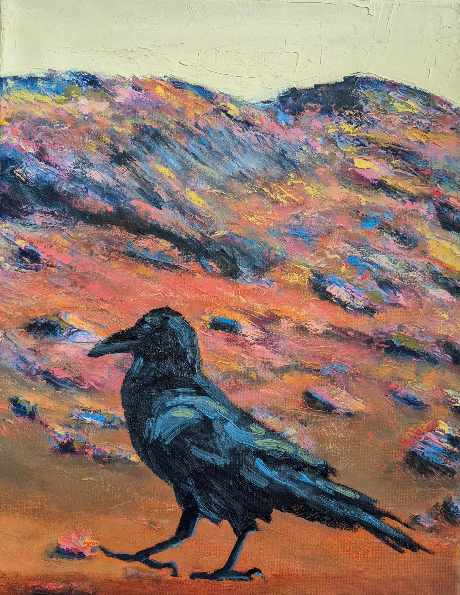 The birds are based on a funny raven I saw while vacationing out west in October 2024. Painting the ravens onto a Martian landscape, to me, feels symbolic of my own adventures to faraway lands: intellectual, imaginative, and physical.